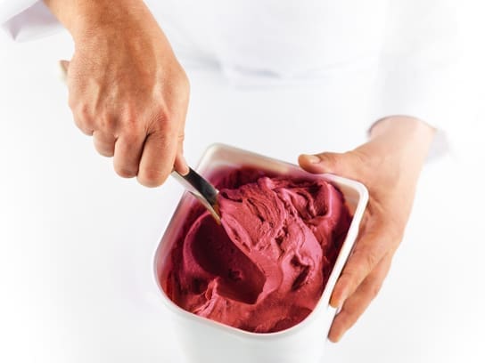 Sorbet : fraise, framboise, passion, mangue, ananas, citron, cassis, myrtille, poire, abricot, mandarine, pêche, melon