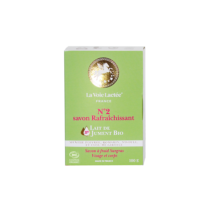 La Voie Lactée® N°2 savon rafraîchissant, apporte fraîcheur et pureté aux peaux les plus exigeantes, enrichit de 20% de lait de jument bio La Voie Lactée®, de quatre huiles essentielles : menthe poivrée, romarin, niaouli, et de clou de girofle et d’argile verte surfine. Ce savon surgras est naturellement riche en glycérine car obtenu par saponification à froid. Il est respectueux de vôtre peau et de l’environnement.