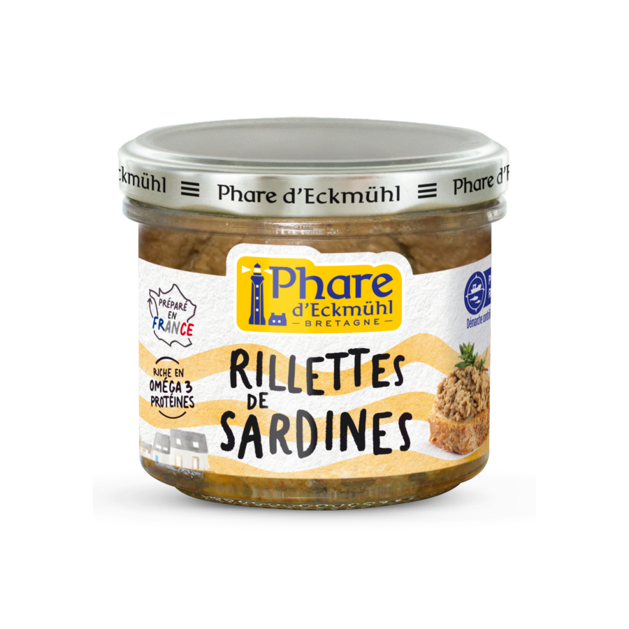 Phare d’EckmĂ¼hl vous propose des rillettes de sardines, issues d’une pĂªche responsable. Elles sont prĂ©parĂ©es avec des ingrĂ©dients simples et cuisinĂ©es Ă Douarnenez dans nos ateliers.